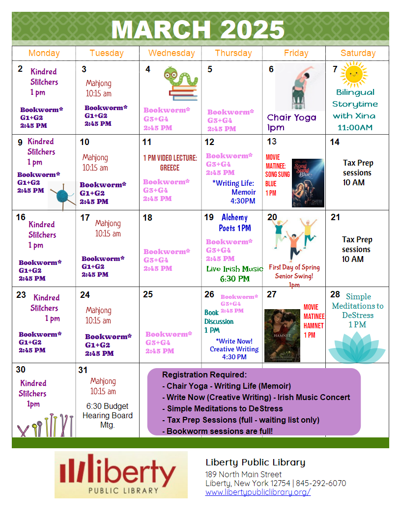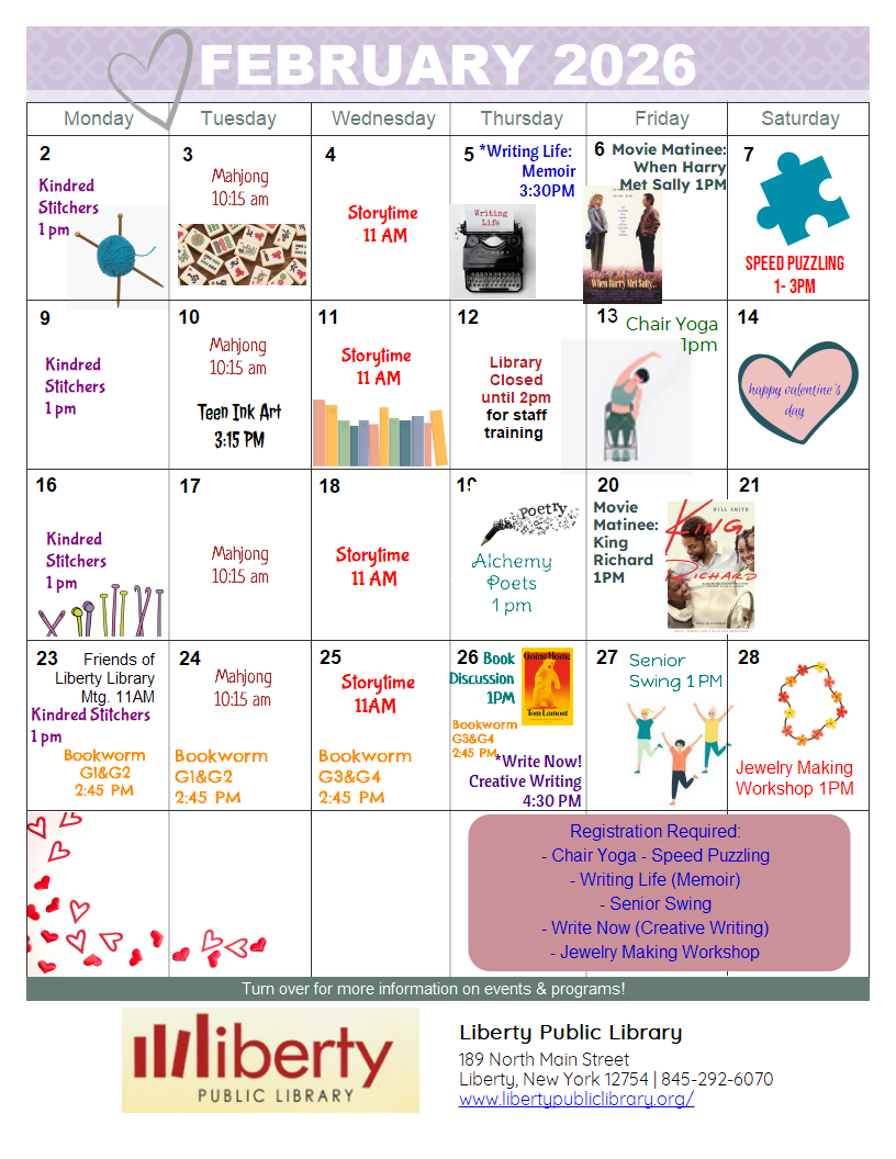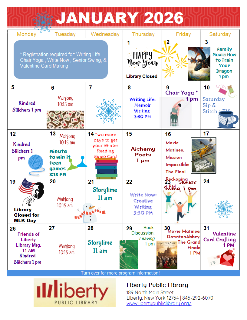 We are now open in our newly expanded and remodeled building at 189 North Main Street in Liberty. Borrow books, movies, books on CD, magazines, and more! We have programs for all ages, as well as copying, faxing, and scanning services. The library is now fully accessible at both entrances with an elevator at our rear program room. Questions? Call us at 845-292-6070.